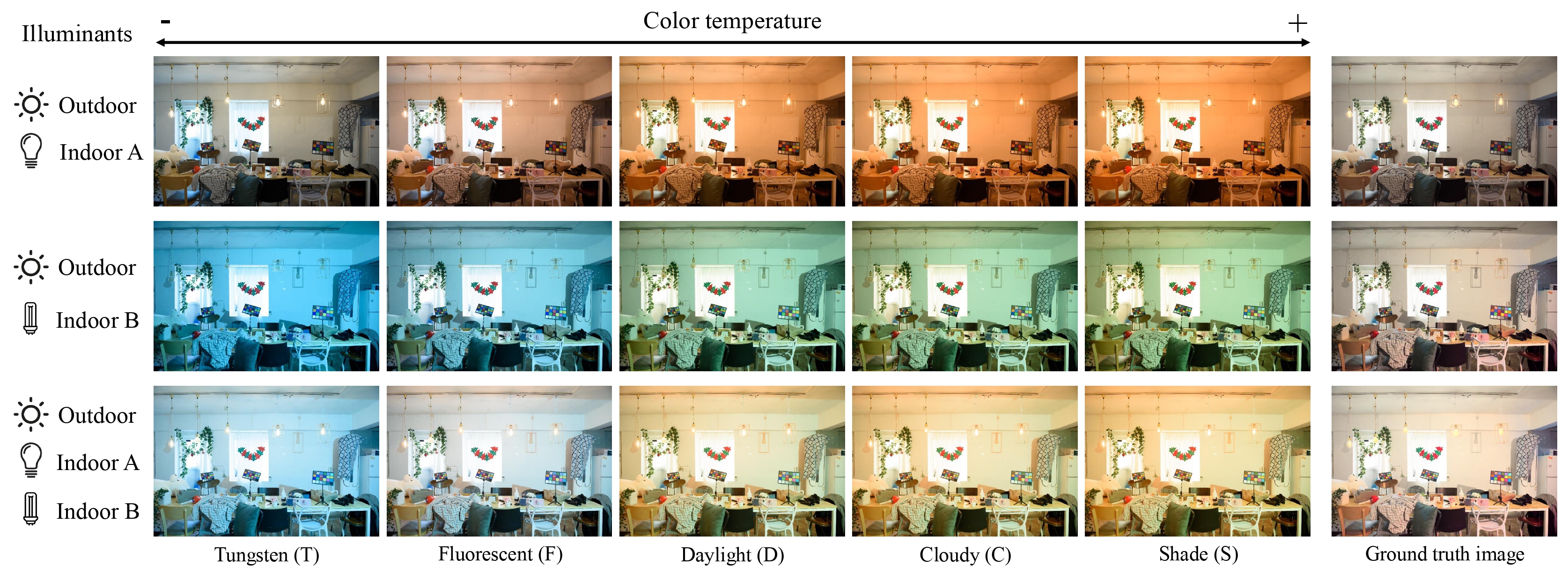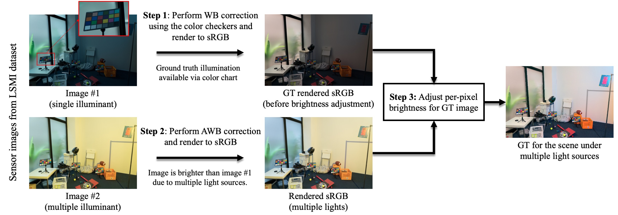 We repurpose the Sony and Nikon splits of the LSMI dataset. We render all the images with multiple illuminants into five different WB presets: Fluorescent (2850 Kelvin), Tungsten (3800 K), Daylight (5500 K), Cloudy (6500 K), and Shade (7500 K). To obtain the ground truth, we first apply WB correction using the color chart on the single illuminant image, as shown in step 1 of the Figure below. However, this initial ground truth image often has less brightness than an image of the same scene with additional light sources. To correct the brightness discrepancies, we render the multi-illuminant image to sRGB using a standard AWB procedure as shown in step 2 of the Figure below. While AWB does not produce a correct WB image under mixed lighting, it provides a reference for per-pixel brightness normalization of the single-illuminant ground truth image, as shown in step 3 of the Figure below. This brightness adjustment assumes a Lambertian reflectance model, a fair approximation for plausible white-balanced images that maintain spatial consistency with multi-illuminant images. Our dataset provides a valuable benchmark for training and evaluating fusion-based multi-illuminant WB methods, as it introduces real-world variations absent in the synthetic test set. The final dataset includes 16,284 sRGB images from the Nikon and Sony sets.